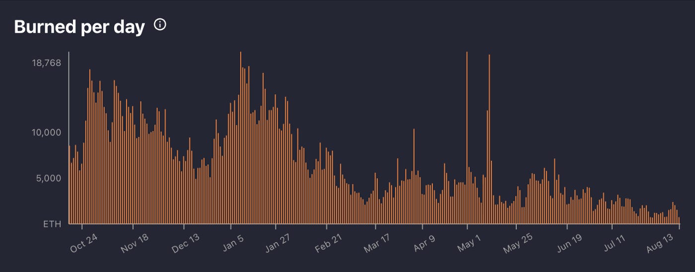 During the last 30 days in the month of August, during which ETH price has been up over +50%, the gas burn has been a mere ~1,300 ETH per day: